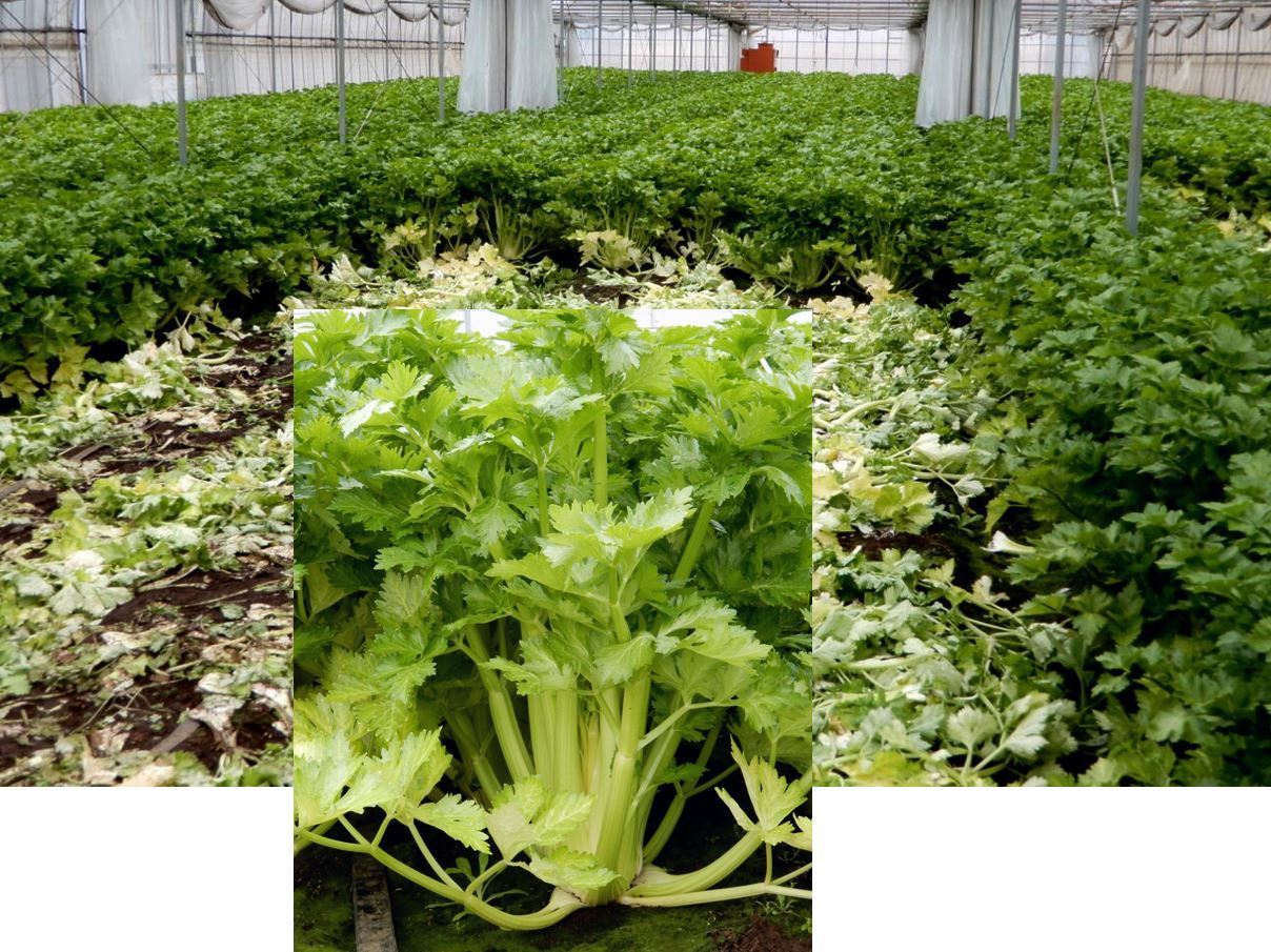 セルリー栽培の並木さん、山口総料理長、私、カラフル野菜の