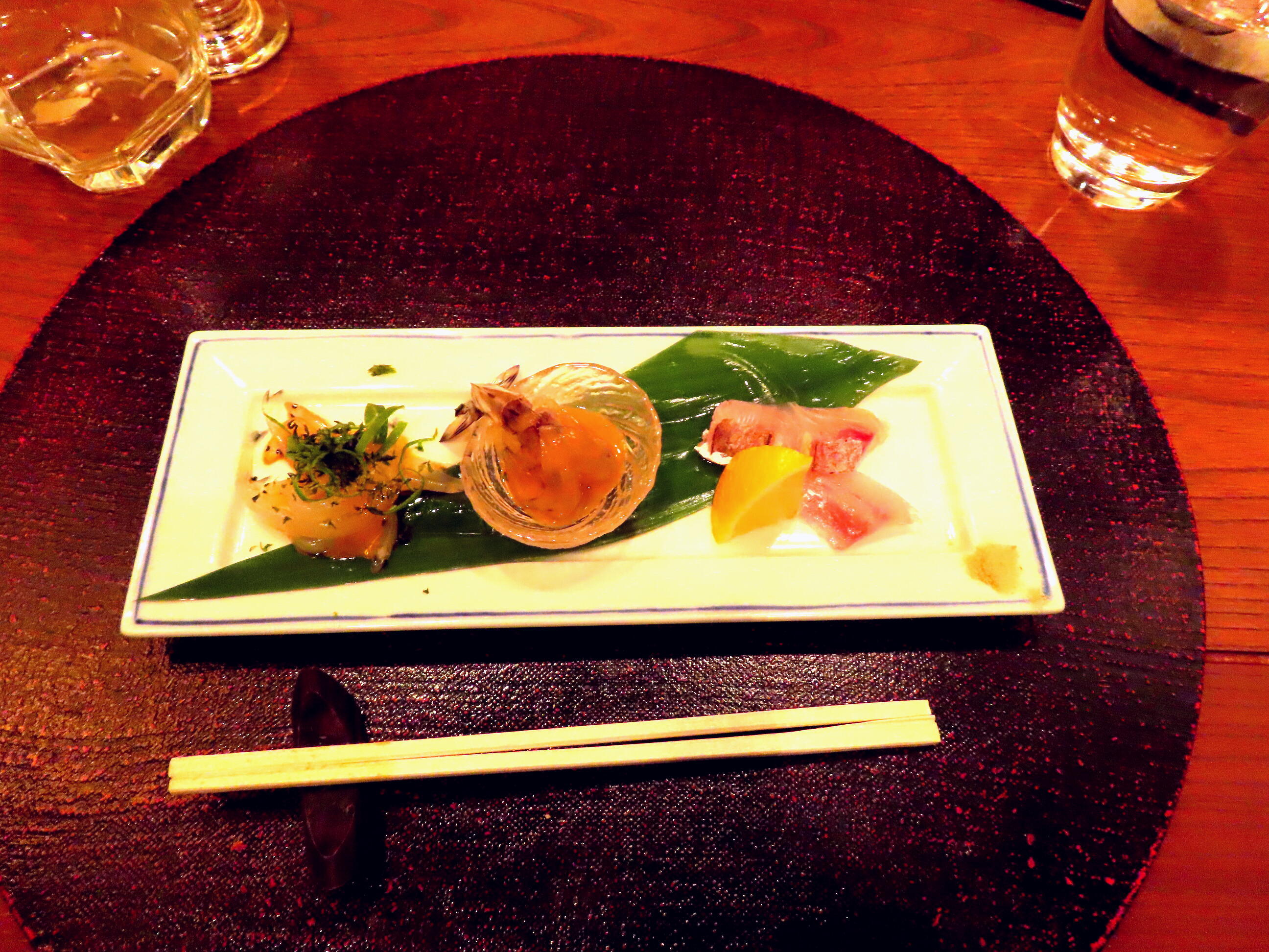 真鯛 自家製旨味塩とレモン、活車海老 海老味噌餡、白魚黄身醤油和え