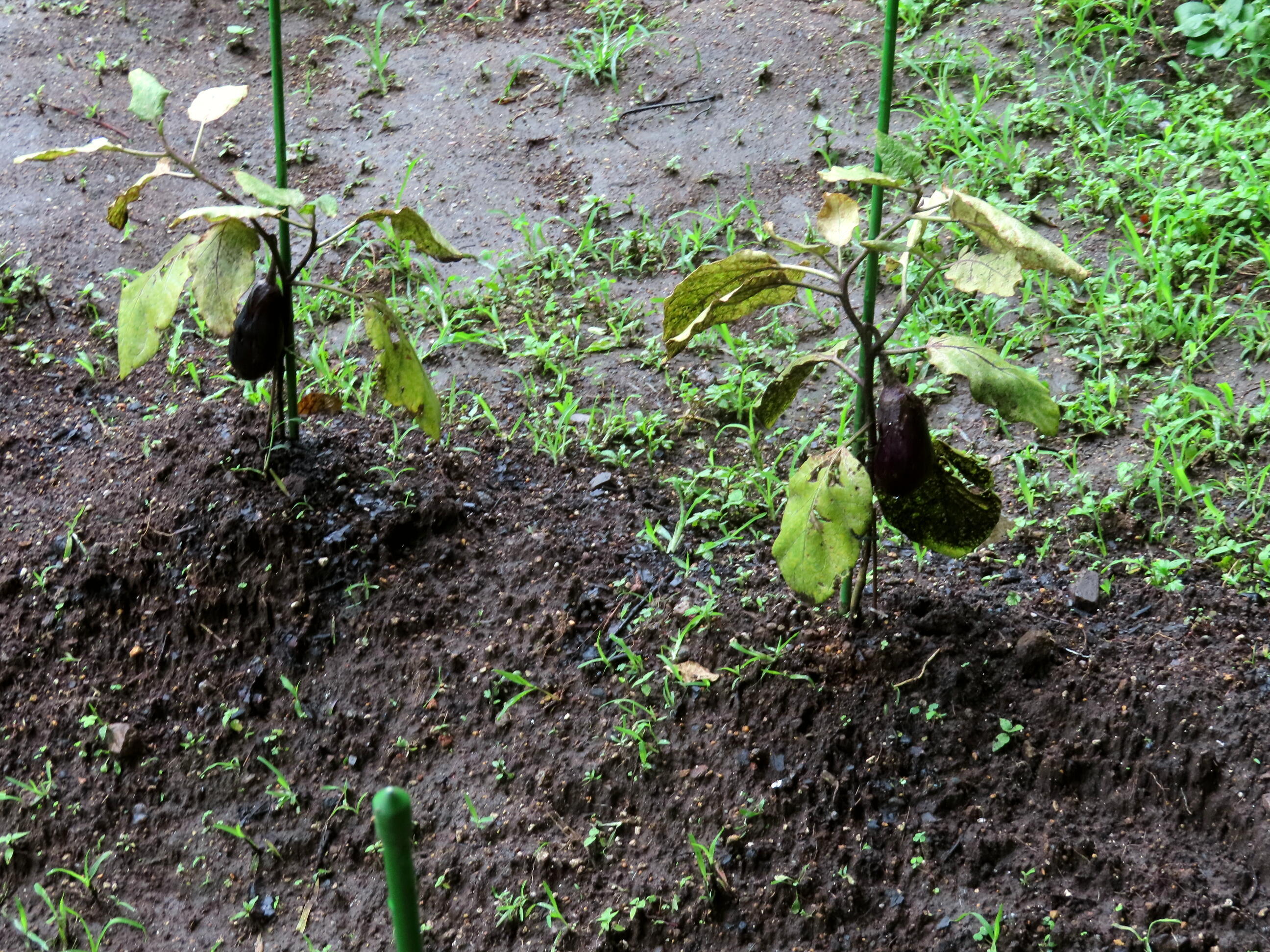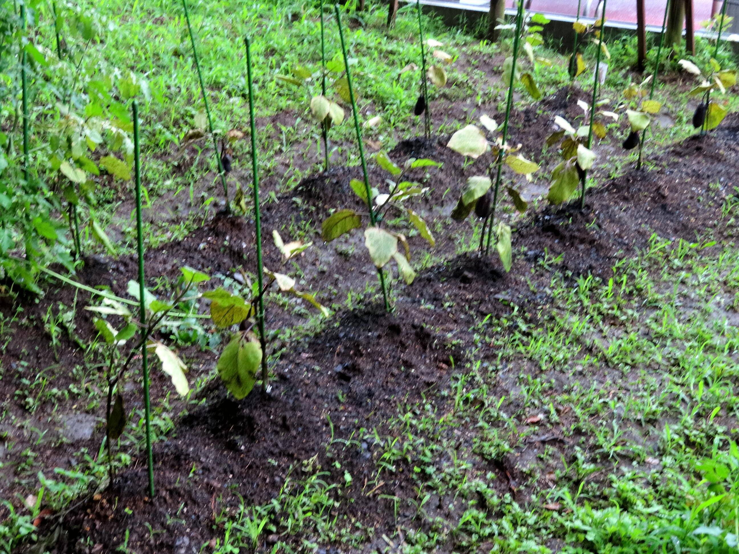 葉の色が悪い。どの苗も、大きくなったナスが生っていた。