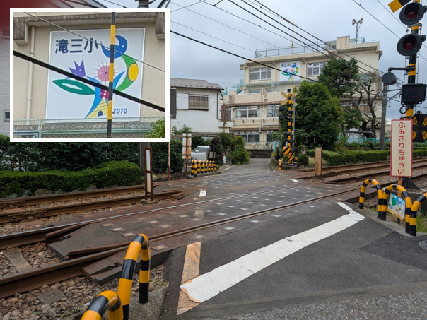 踏切の先に、4階建ての滝三小。