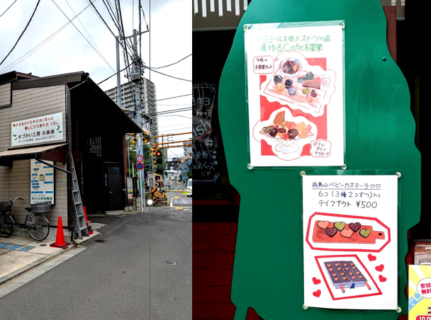 校門を出たら、踏切の近くに「木づかい工房 木楽楽」の材木屋さん。