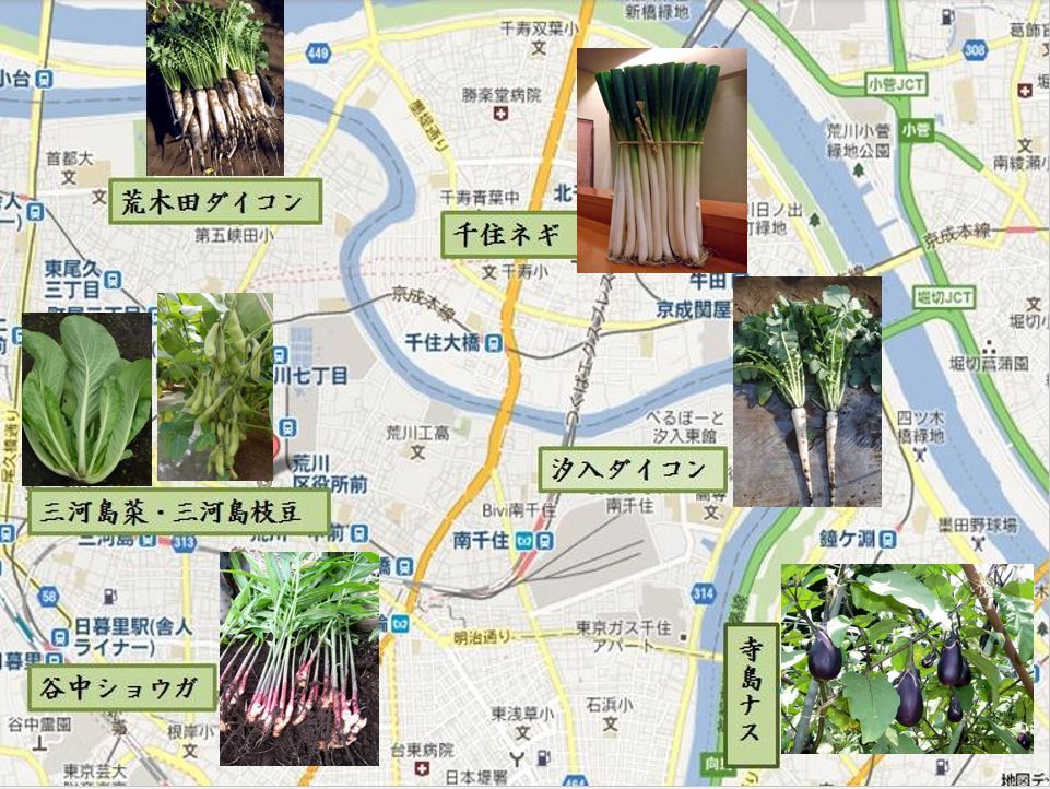 三河島菜、三河島枝豆、荒木田ダイコン、汐入大根があり、近隣では