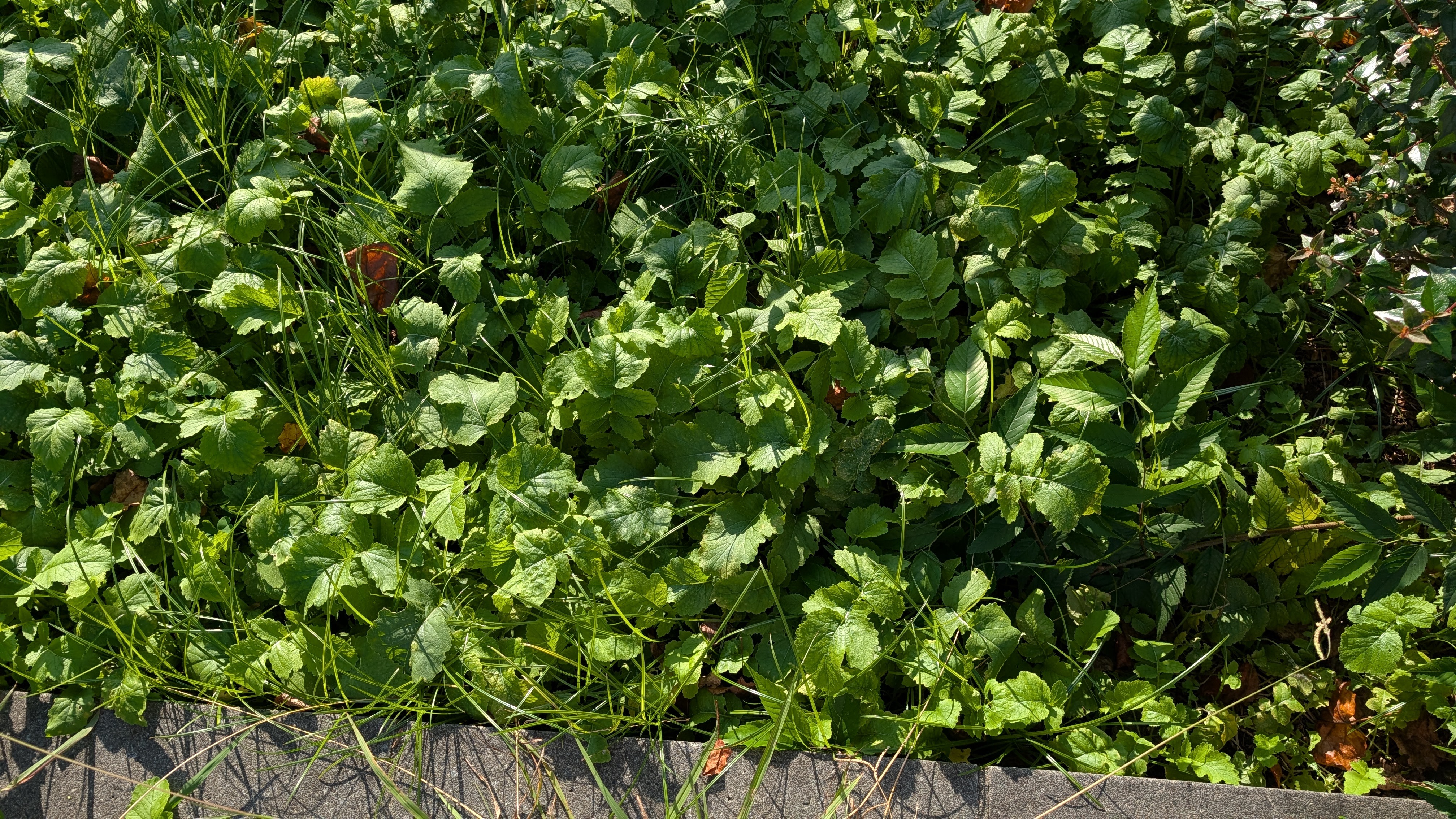 10月23日、濠大根のタネが落ちこぼれた歩道脇の緑地は、