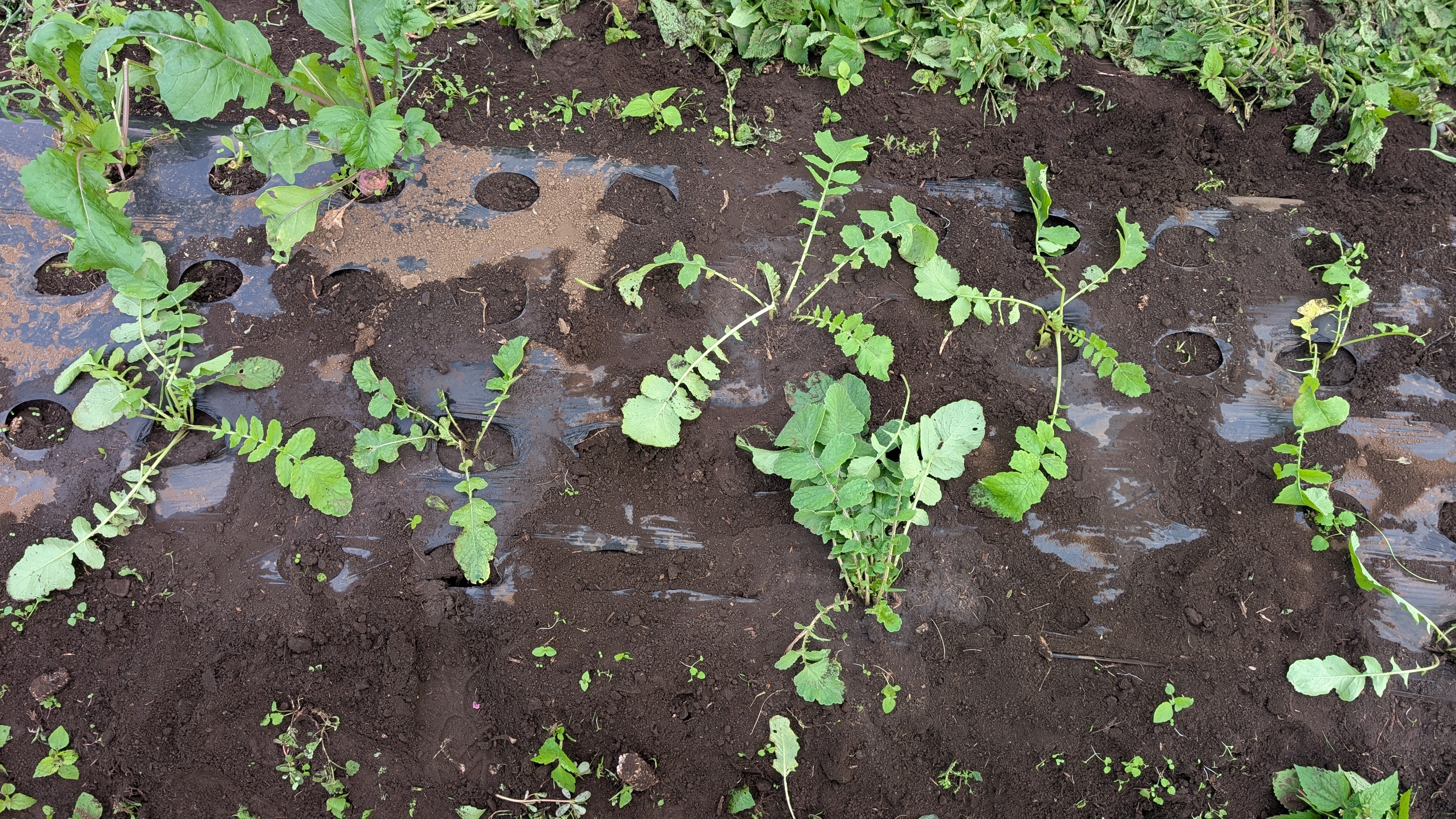 カブのあやめ雪が収穫され、黒いマルチの穴が開いたところに、