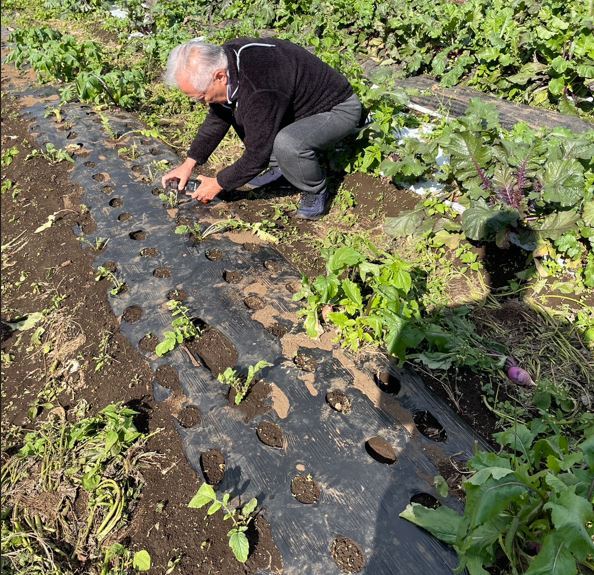 あやめ雪を収穫して、あいた黒マルチの穴に定植した。