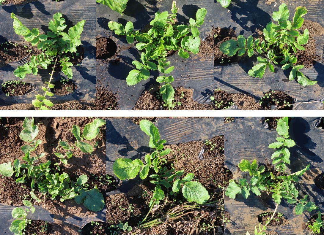 カブのあやめ雪を収穫した後の穴に植えた。(黄色の枠内に14本)