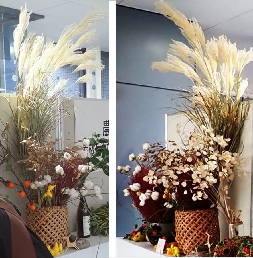 右の作品は、飯を炊くお釜に、秋のコキア(ほうき草)は、