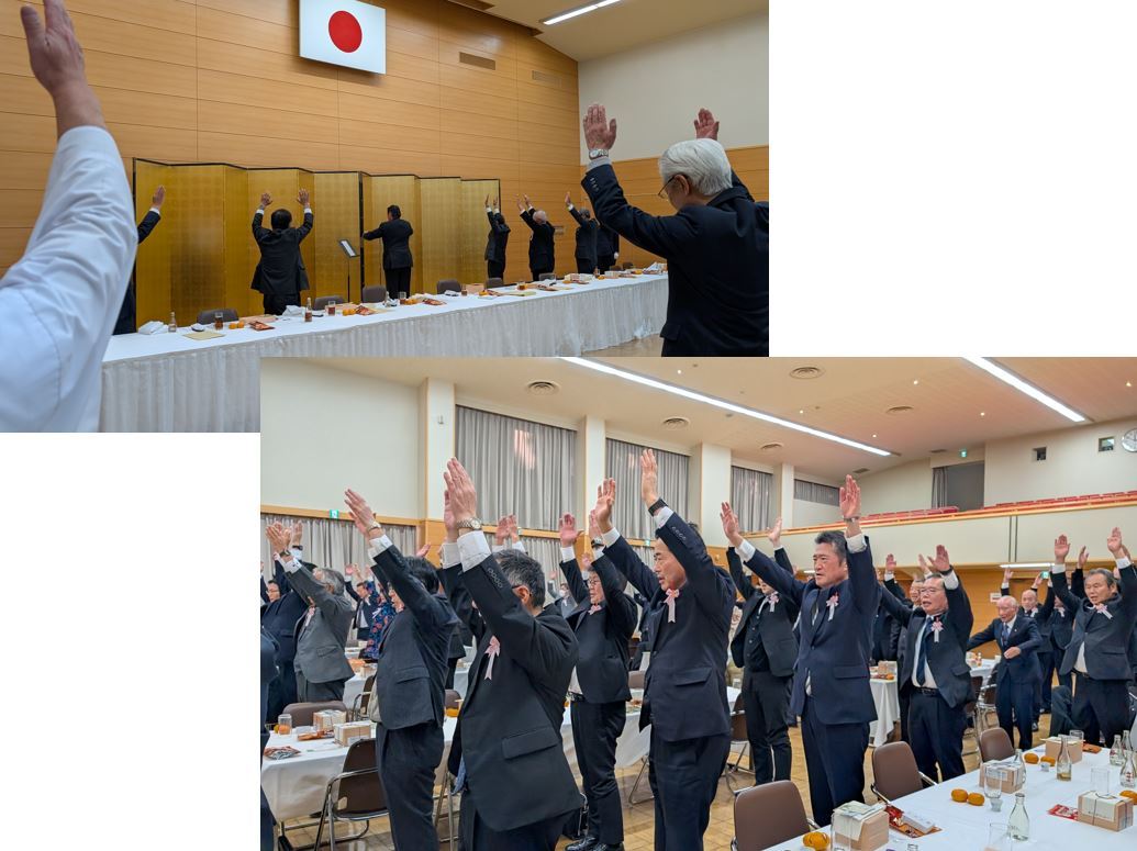 時間が来たところで、眞利子副会長の万歳三唱は、国旗に向かって